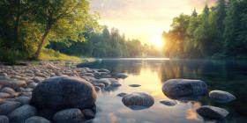 Serene Sunset on the Riverbank: A Tranquil Scene with Smooth Stones and a Golden Sky