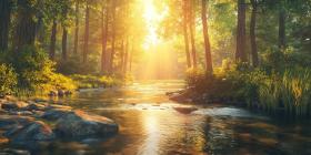 Serene Sunset on the Riverbank: A Tranquil Scene with Smooth Stones and a Golden Sky