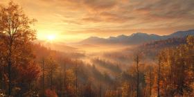 A Golden Dawn Illuminates a Misty Valley, Painting the Autumn Foliage in Warm Hues