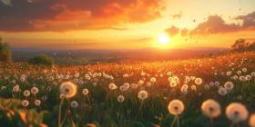 A Field of Dreams: A Breathtaking Sunset Bathes a Meadow of Dandelions in a Golden Glow, as Birds Take Flight