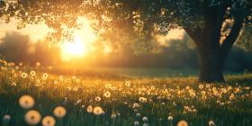 A Field of Dreams: A Breathtaking Sunset Bathes a Meadow of Dandelions in a Golden Glow, as Birds Take Flight