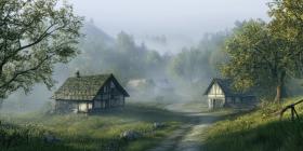 A Misty Morning in the Village: A Path Winds Through a Fog-Shrouded Hamlet, Where Quaint Cottages Nestled Amongst the Trees