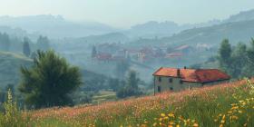 A Misty Morning in the Village: A Path Winds Through a Fog-Shrouded Hamlet, Where Quaint Cottages Nestled Amongst the Trees