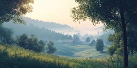 A Misty Morning in the Village: A Path Winds Through a Fog-Shrouded Hamlet, Where Quaint Cottages Nestled Amongst the Trees