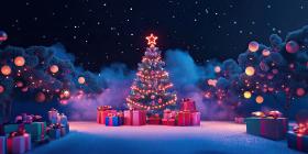 A Neon Christmas: A Decorated Christmas Tree Gleams with Colorful Lights, Surrounded by Wrapped Gifts in a Dreamy, Neon-Lit Setting