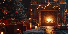 A Magical Christmas Eve: A Cozy Fireplace Blazes Brightly, Casting a Warm Glow on a Room Adorned with a Sparkling Tree and Wrapped Gift