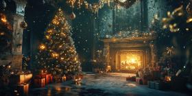 A Magical Christmas Eve: A Cozy Fireplace Blazes Brightly, Casting a Warm Glow on a Room Adorned with a Sparkling Tree and Wrapped Gift