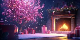 A Magical Christmas Eve: A Cozy Fireplace Blazes Brightly, Casting a Warm Glow on a Room Adorned with a Sparkling Tree and Wrapped Gift