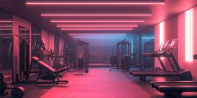 Neon Pulse: A Modern Gym Bathed in Vibrant Pink and Blue Lighting, Inviting You to Elevate Your Workout