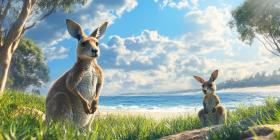Coastal Kangaroo Companions: A mother and joey kangaroo survey their coastal surroundings