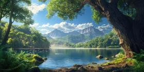 Serene Lakeside Serenity: A Tranquil Scene of a Lake Under a Blue Sky with Fluffy Clouds