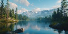 Serene Lakeside Serenity: A Tranquil Scene of a Lake Under a Blue Sky with Fluffy Clouds