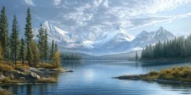 Serene Lakeside Serenity: A Tranquil Scene of a Lake Under a Blue Sky with Fluffy Clouds