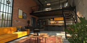 Loft Living: A Spacious Industrial-Style Apartment with Exposed Brick Walls, a Mezzanine Level, and Vibrant Yellow Accents