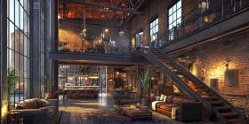 Loft Living: A Spacious Industrial-Style Apartment with Exposed Brick Walls, a Mezzanine Level, and Vibrant Yellow Accents