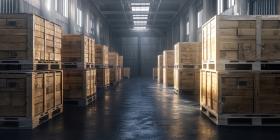 A Warehouse of Possibilities: Wooden crates stacked high in a sunlit warehouse, ready for distribution