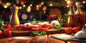 Sunlight Drenched Cherry Tomatoes with Fresh Basil and a Sprinkle of Parmesan Cheese on a Rustic Wooden Platter, Capturing the Essence of Summer Freshness and Italian Cuisine