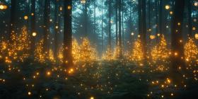 Enchanted Forest Pathway Illuminated with Warm Fairy Lights at Twilight