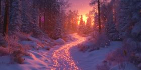 Winter Wonderland: A Magical Forest Path Illuminated by Twinkling Lights as the Sun Sets Behind the Trees
