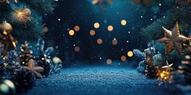 Festive Christmas Scene with a Snowy Forest Floor, Decorated with Gold Ornaments, Stars, and Pine Cones, Illuminated by Warm Lights
