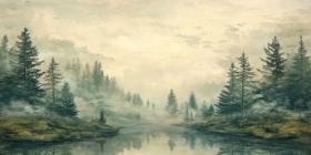 Serene Mountain Landscape at Sunset with a Field of Purple Flowers and a Misty Forest Silhouette