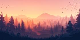 Serene Mountain Landscape at Sunset with a Field of Purple Flowers and a Misty Forest Silhouette