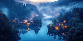 Eerie Twilight Descends on a Picturesque Riverfront Village Nestled Among Foggy Mountains