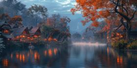 Eerie Twilight Descends on a Picturesque Riverfront Village Nestled Among Foggy Mountains