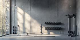 Industrial-Style Home Gym with Concrete Walls and Modern Fitness Equipment