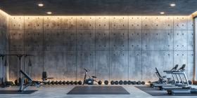 Industrial-Style Home Gym with Concrete Walls and Modern Fitness Equipment