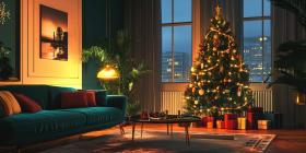Luxurious Living Room Decorated for Christmas with a Grandly Adorned Christmas Tree, Plush Seating, and Festive Lighting