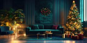 Luxurious Living Room Decorated for Christmas with a Grandly Adorned Christmas Tree, Plush Seating, and Festive Lighting