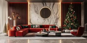 Opulent Living Room Interior with a Modern Christmas Tree, a Marble Wall Feature, and a Plush Red Sectional Sofa