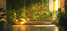 Opulent Living Room Interior with a Modern Christmas Tree, a Marble Wall Feature, and a Plush Red Sectional Sofa