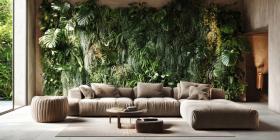 Opulent Living Room Interior with a Modern Christmas Tree, a Marble Wall Feature, and a Plush Red Sectional Sofa