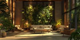 Opulent Living Room Interior with a Modern Christmas Tree, a Marble Wall Feature, and a Plush Red Sectional Sofa
