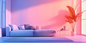 Opulent Living Room Interior with a Modern Christmas Tree, a Marble Wall Feature, and a Plush Red Sectional Sofa
