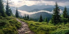 Eerie Stone Path Winding Through a Fog-Shrouded Forest