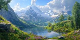 Majestic Snow-Capped Mountain Peak Rising Above a Lush Green Valley Under a Bright Blue Sky