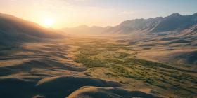 Golden Hour Panorama of Rolling Hills and Mountain Ranges Bathed in Warm Sunlight