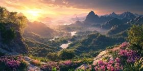 Serene Meadow bathed in Golden Sunlight at Sunrise with rolling hills and a distant mountain range.