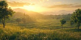 Serene Meadow bathed in Golden Sunlight at Sunrise with rolling hills and a distant mountain range.