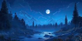 Serene Moonlight Illuminates a Tranquil River Winding Through a Forest of Dark Trees and Snow-Capped Mountains