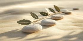 Serene Spa-like Arrangement of Smooth Stones and Delicate Silver Sage Leaves on a Sandy Surface