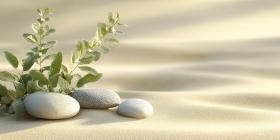 Serene Spa-like Arrangement of Smooth Stones and Delicate Silver Sage Leaves on a Sandy Surface