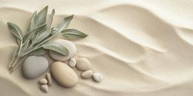 Serene Spa-like Arrangement of Smooth Stones and Delicate Silver Sage Leaves on a Sandy Surface