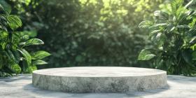 Tropical Paradise Product Display with a Concrete Podium Set Against a Lush Green Wall and Surrounded by Rocks and Palm Leaves