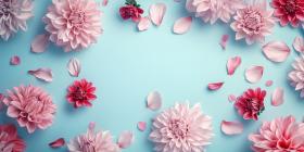 Festive Floral Frame with Vibrant Pink and Peach Dahlias and Delicate Petals on a White Background