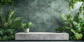 Tropical Paradise Product Display with a Concrete Podium Set Against a Lush Green Wall and Surrounded by Rocks and Palm Leaves