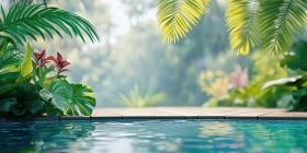 Inviting Poolside Oasis with Lush Tropical Foliage and a Wooden Deck